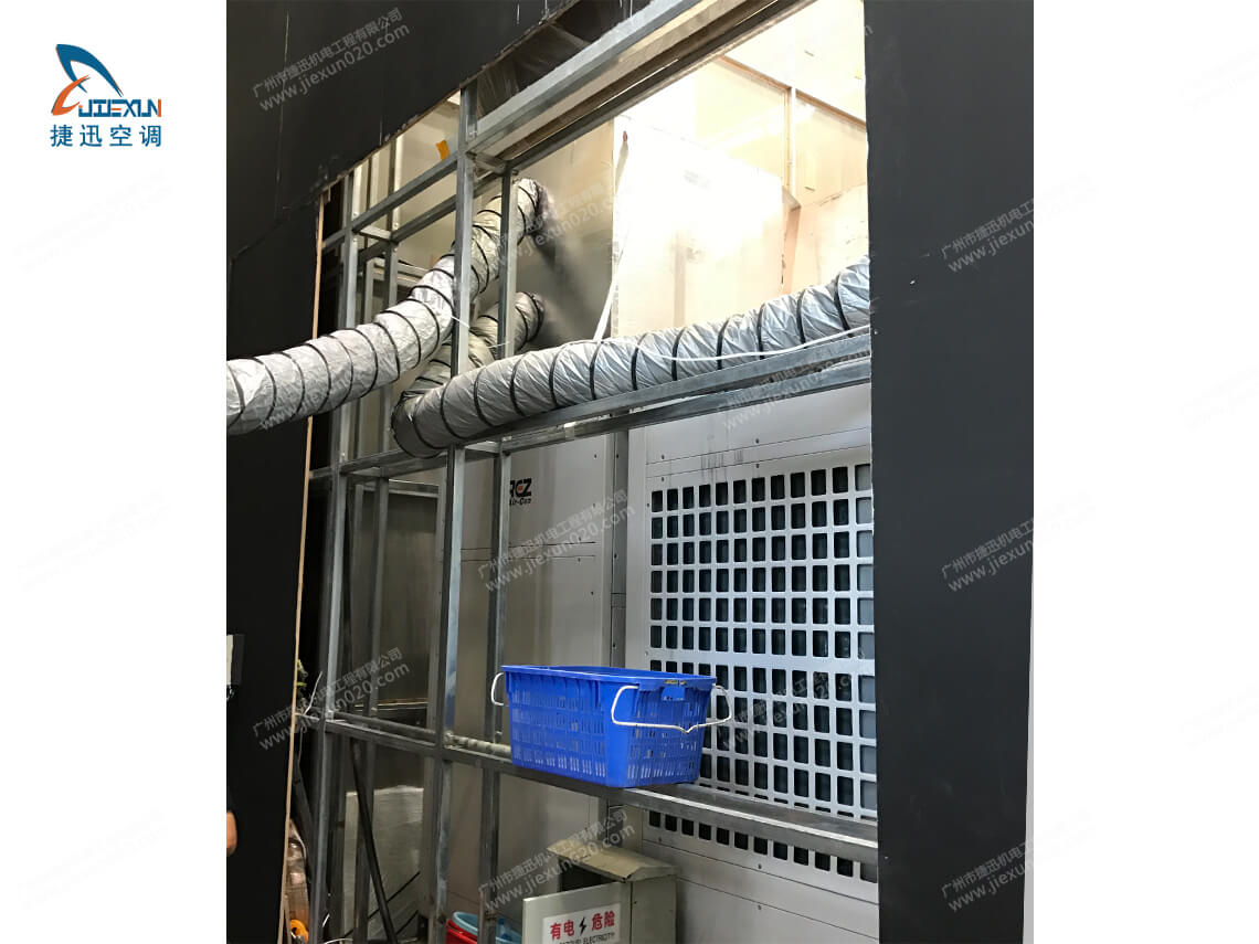 捷迅租赁公司为2020深圳体育场临时活动提供赛事空调出租解决方案,该方案采用30匹篷房专用中央空调和风管搭配使用,空调出租连接方式查看以下视频演示。