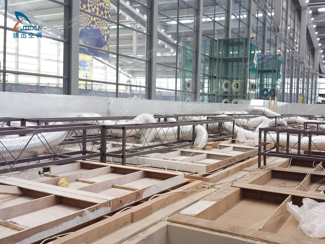 车展供应展会空调出租,本次雷克萨斯的摊位属于特装展示摊位,制冷空调出租方案是使用两台30匹篷房空调,通过风管引进冷气,由天花风口出风。