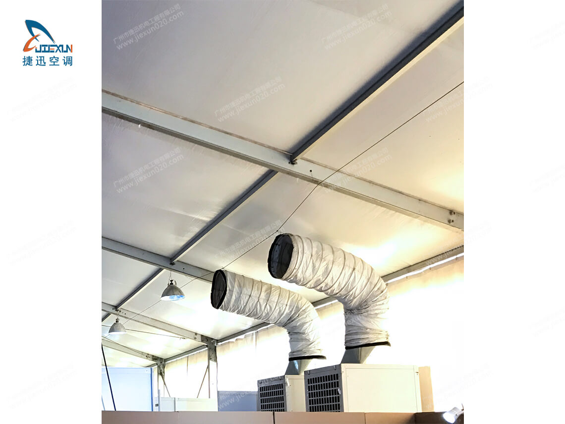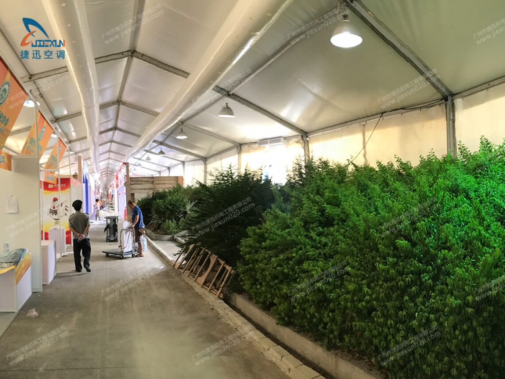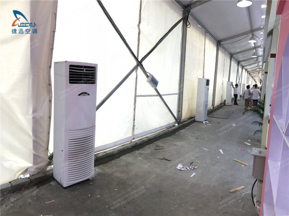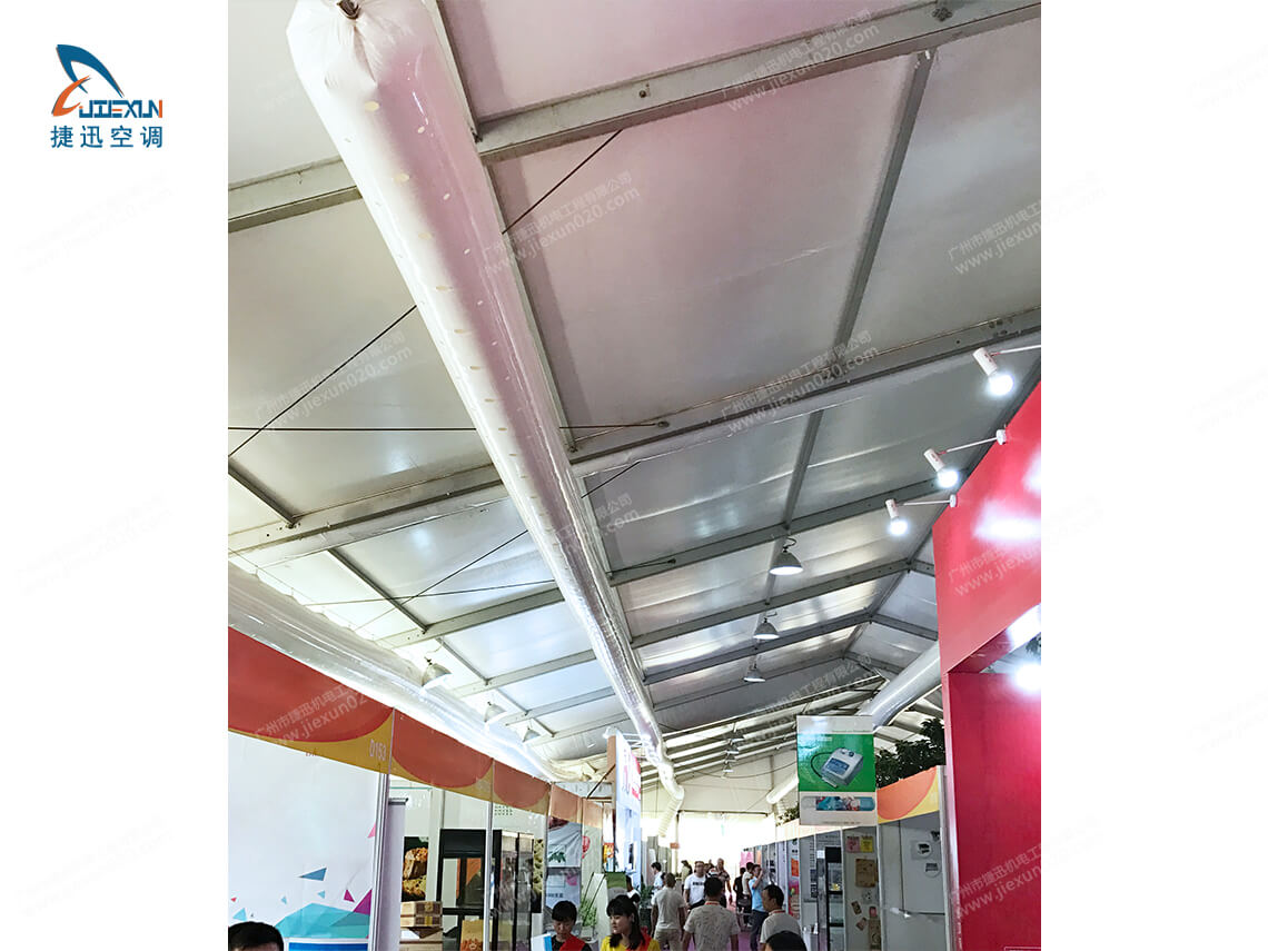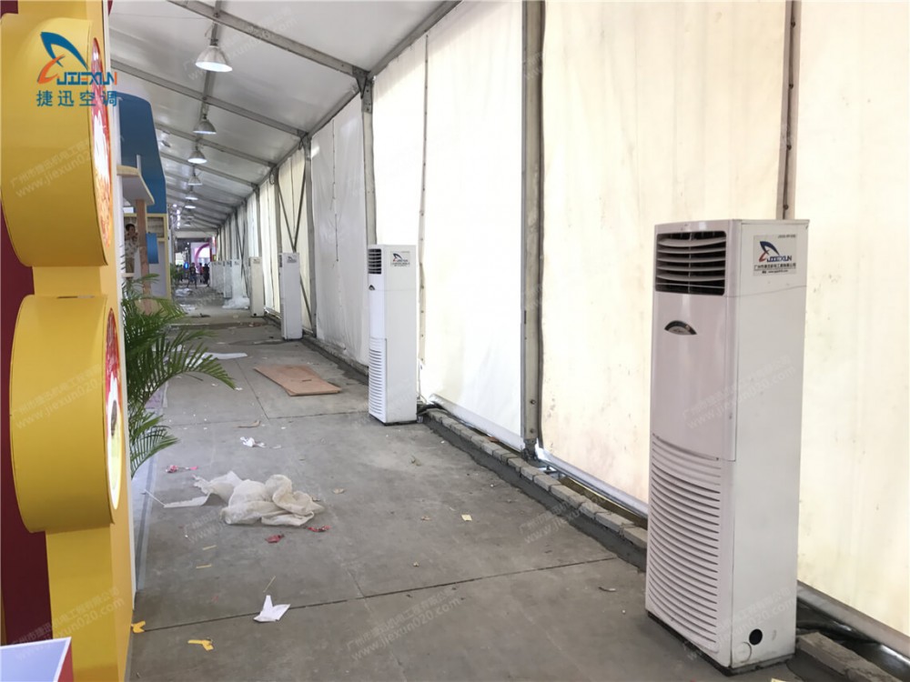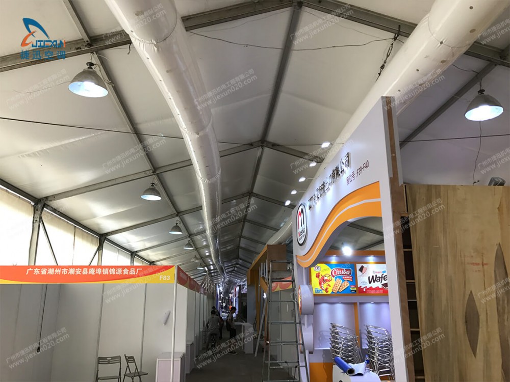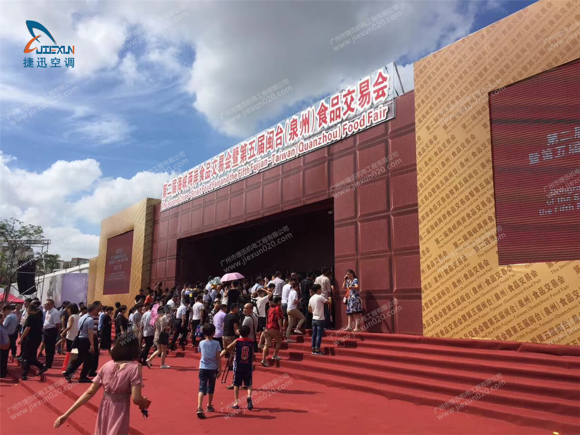 捷迅机电租赁公司为食交会现场空调出租供冷。以篷房空调的出租方案为主,采用风管出风方式,均匀地将冷气覆盖在篷房内部主通道上,再采用一些柜式空调弥补被特装摊位遮挡住冷气的小通道。