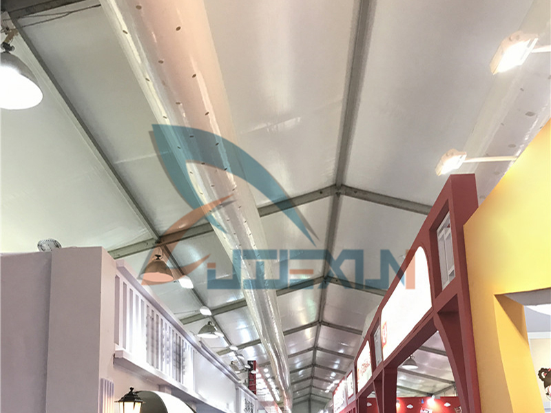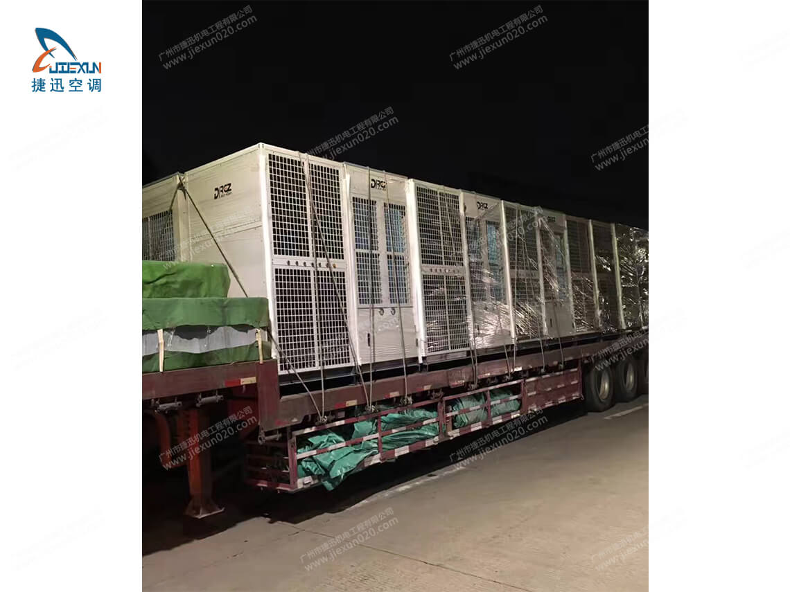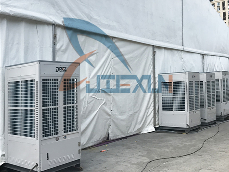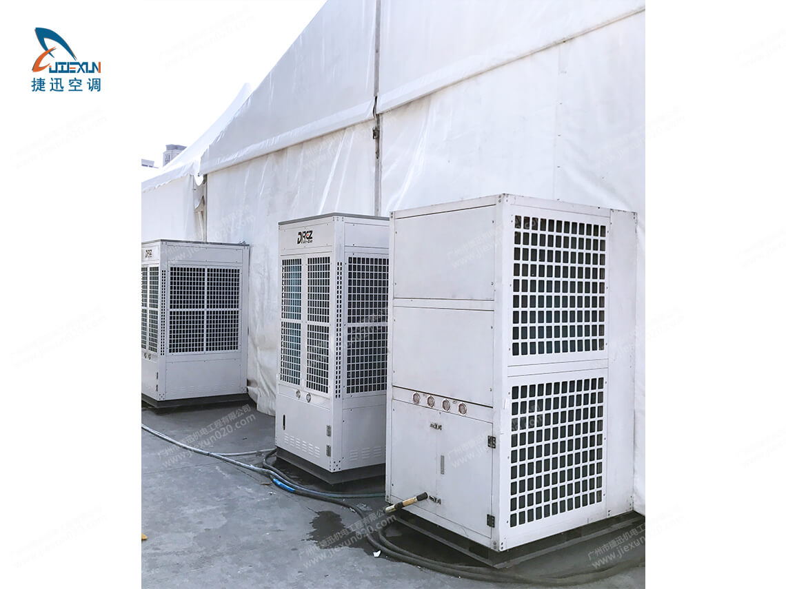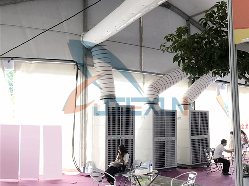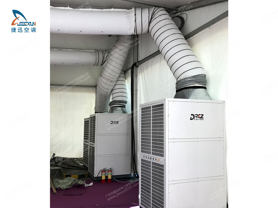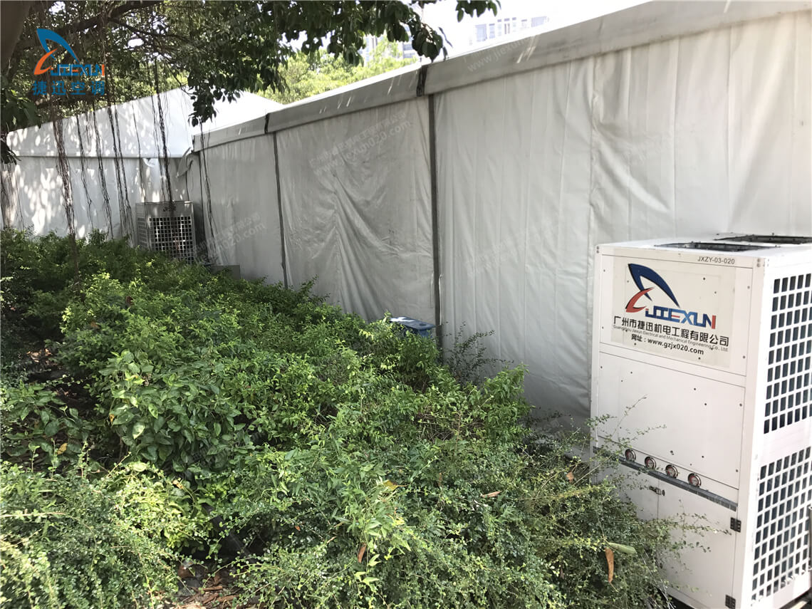 捷迅机电租赁公司为食交会现场空调出租供冷。以篷房空调的出租方案为主,采用风管出风方式,均匀地将冷气覆盖在篷房内部主通道上,再采用一些柜式空调弥补被特装摊位遮挡住冷气的小通道。